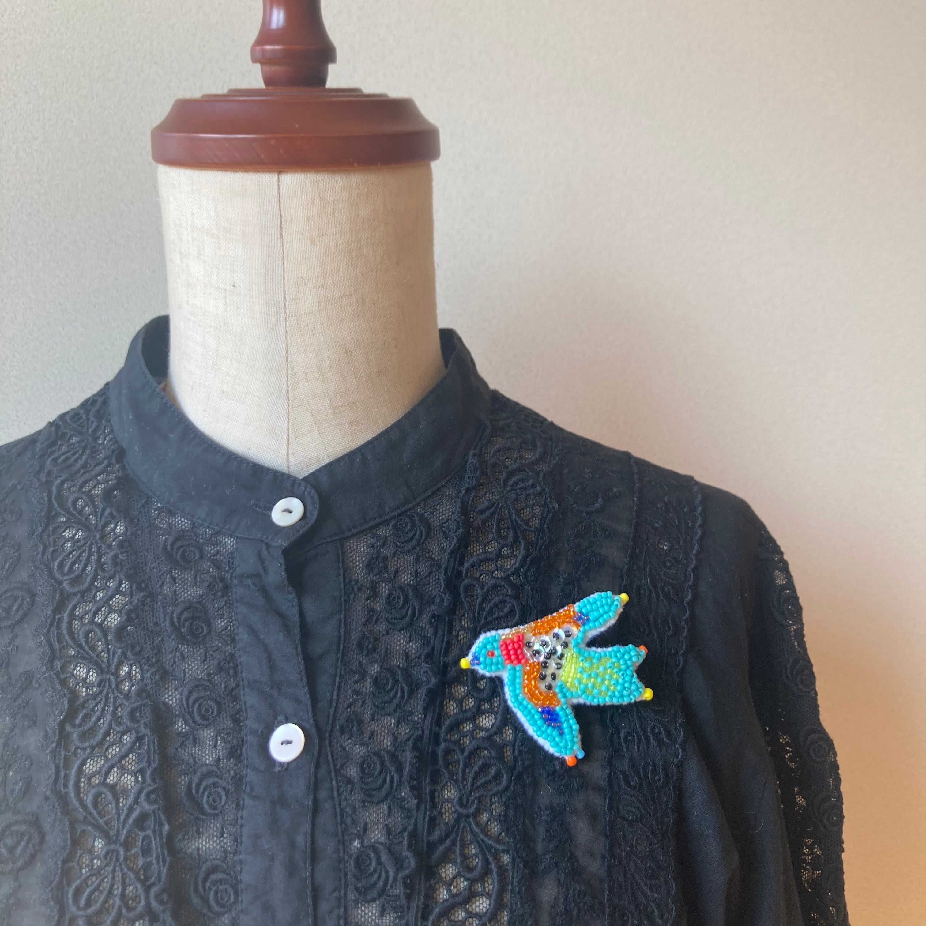 素材:ガラスのシードビーズ/スパングル/ナイロン糸/ポリエステル糸/フェルト薄手・厚手/真鍮ブローチピン(日本製)
