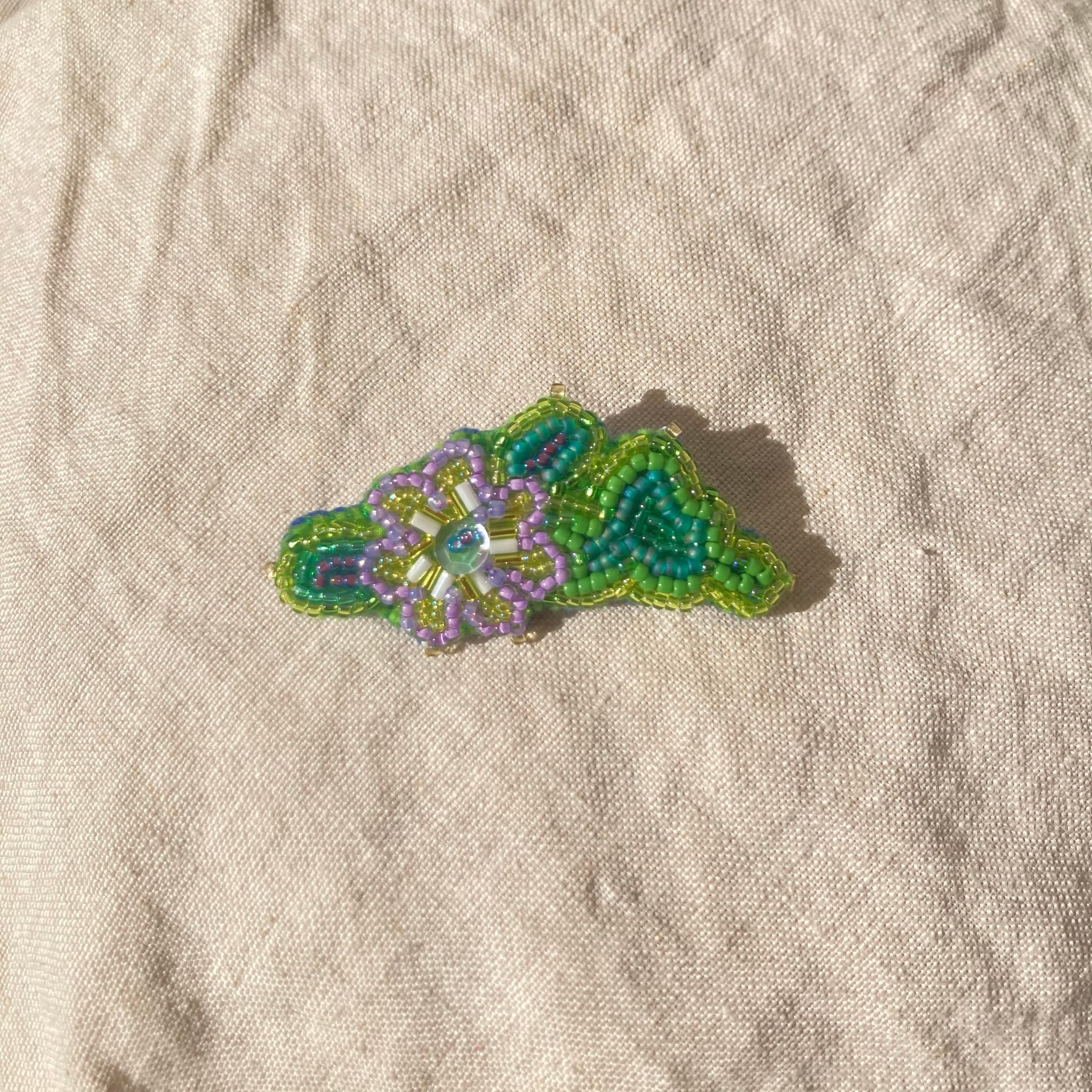 素材:ガラスのシードビーズ/スパングル/ナイロン糸/ポリエステル糸/フェルト薄手・厚手/真鍮ブローチピン(日本製)