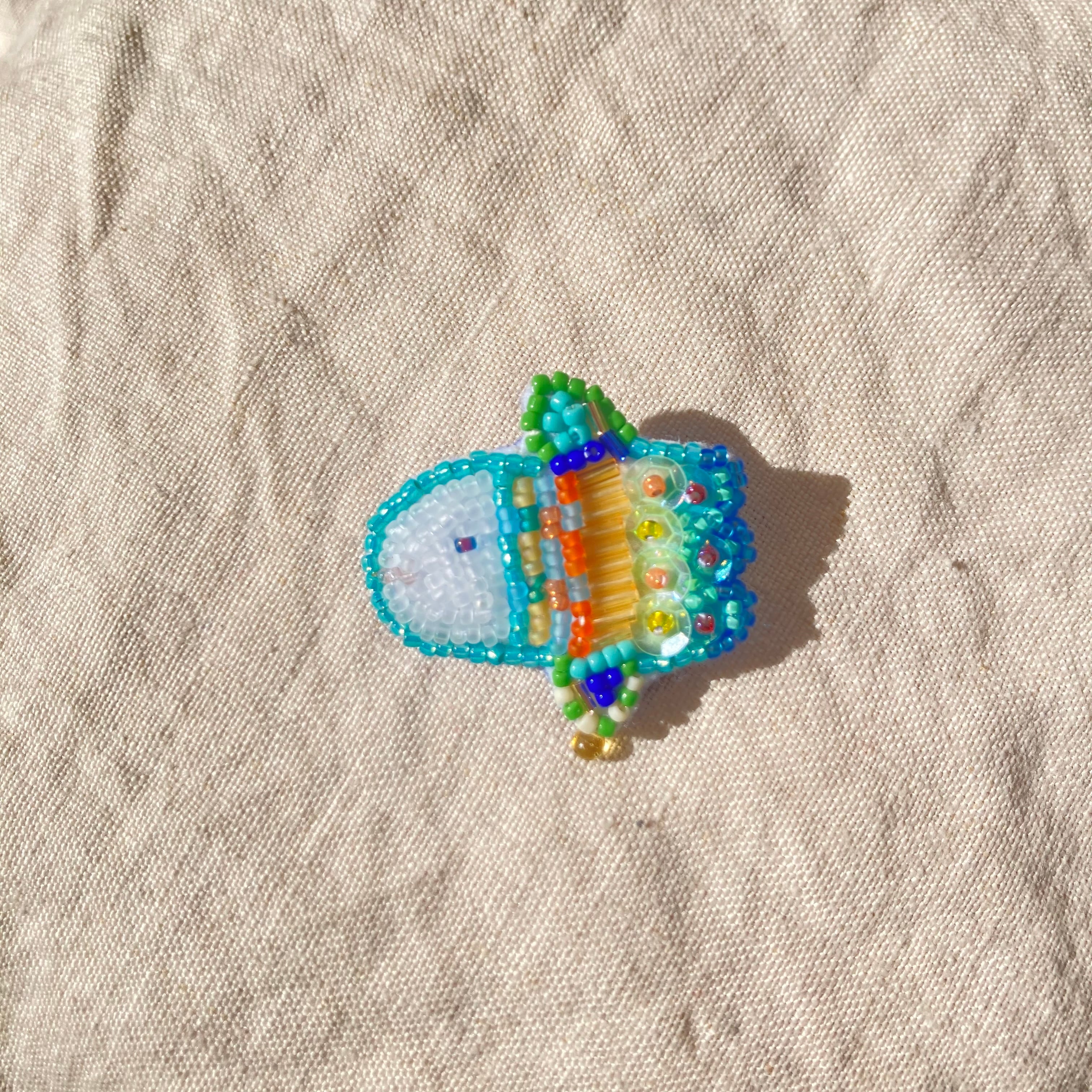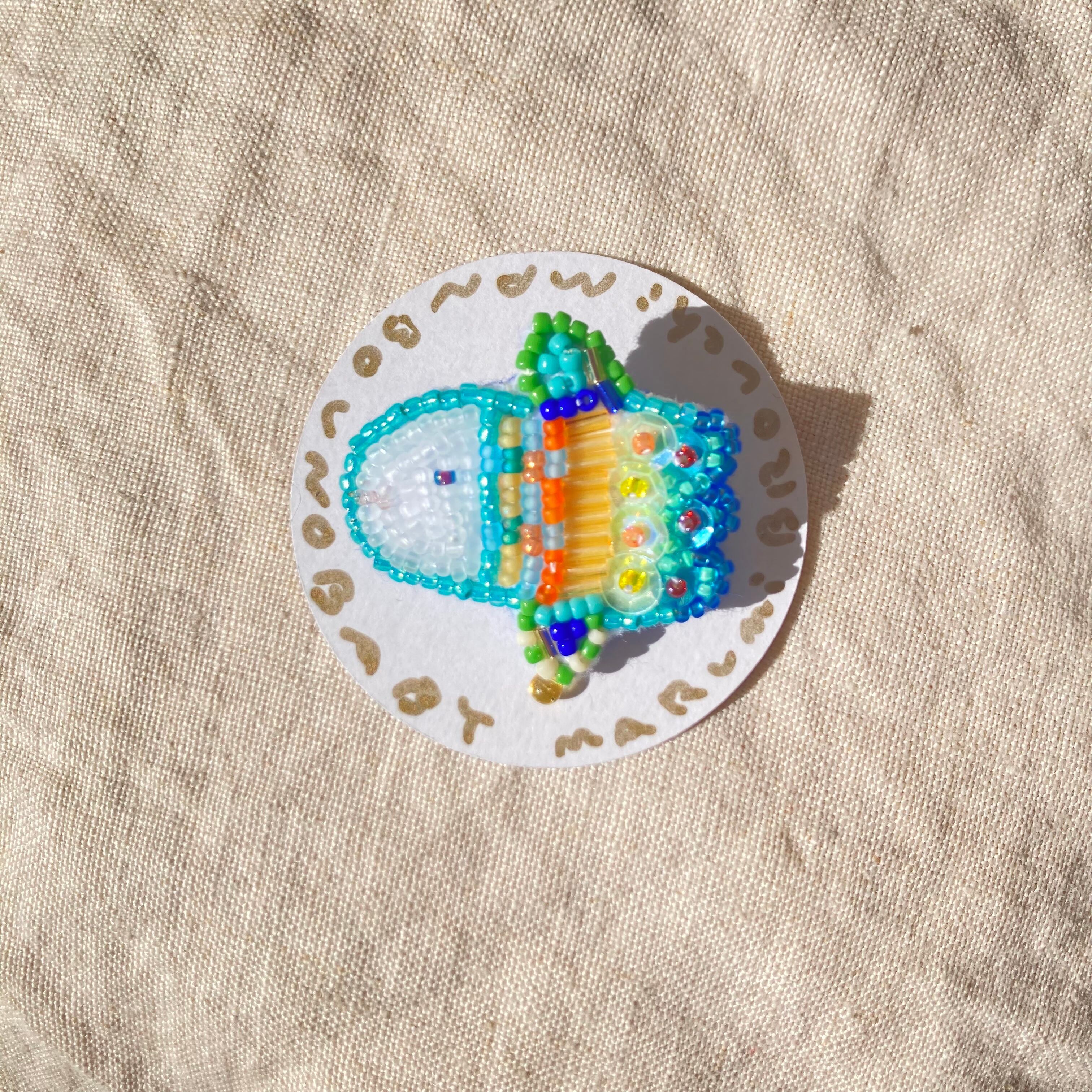素材:ガラスのシードビーズ/スパングル/ナイロン糸/ポリエステル糸/フェルト薄手・厚手/真鍮ブローチピン(日本製)