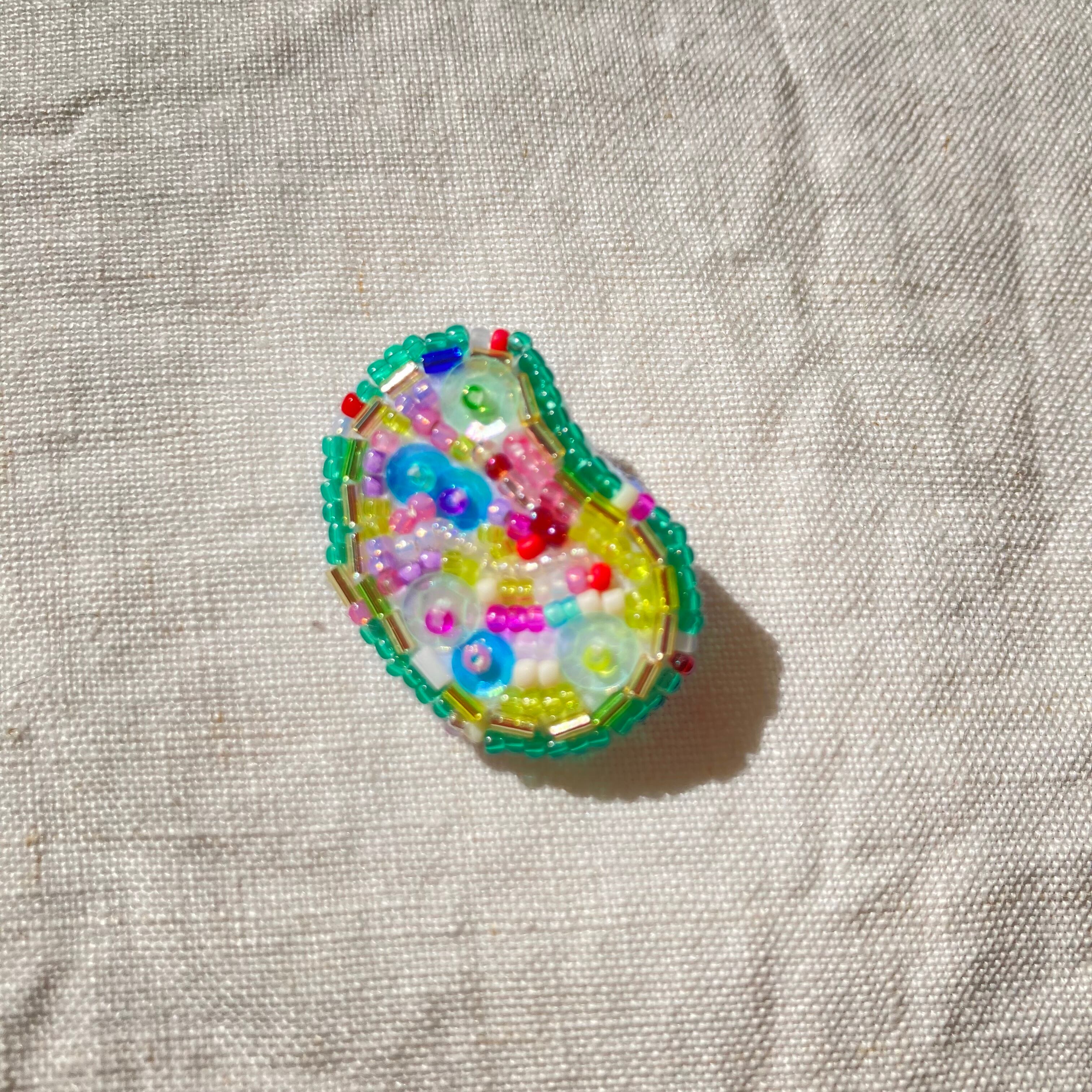 素材:ガラスのシードビーズ/スパングル/ナイロン糸/ポリエステル糸/フェルト薄手・厚手/真鍮ブローチピン(日本製)