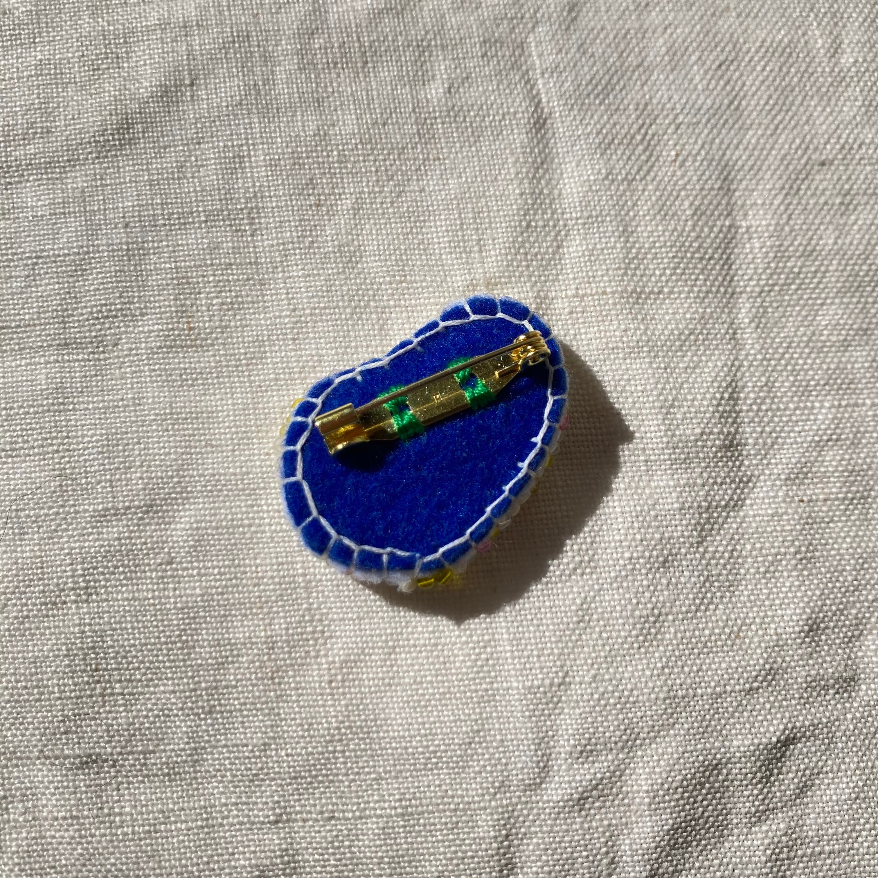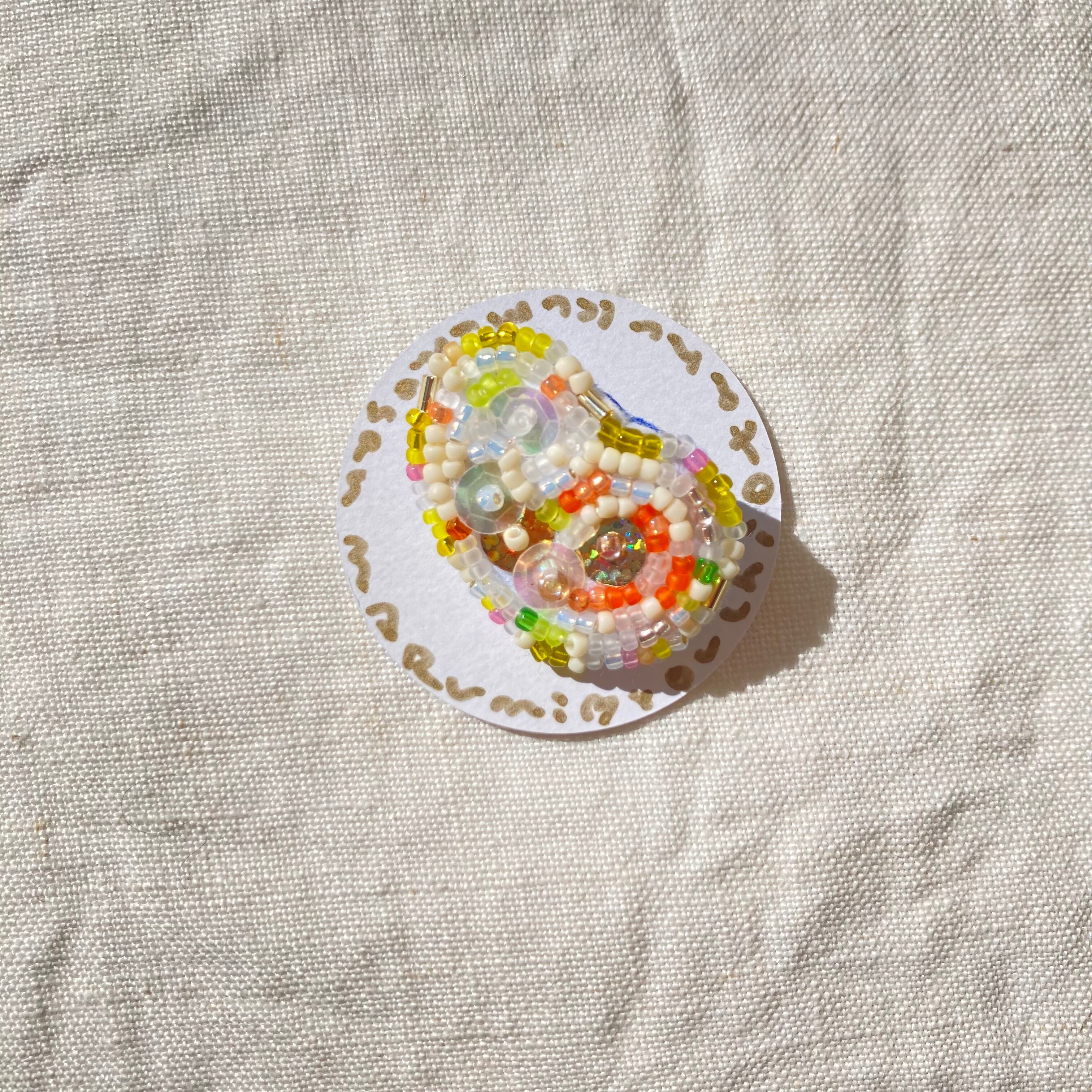 素材:ガラスのシードビーズ/スパングル/ナイロン糸/ポリエステル糸/フェルト薄手・厚手/真鍮ブローチピン(日本製)