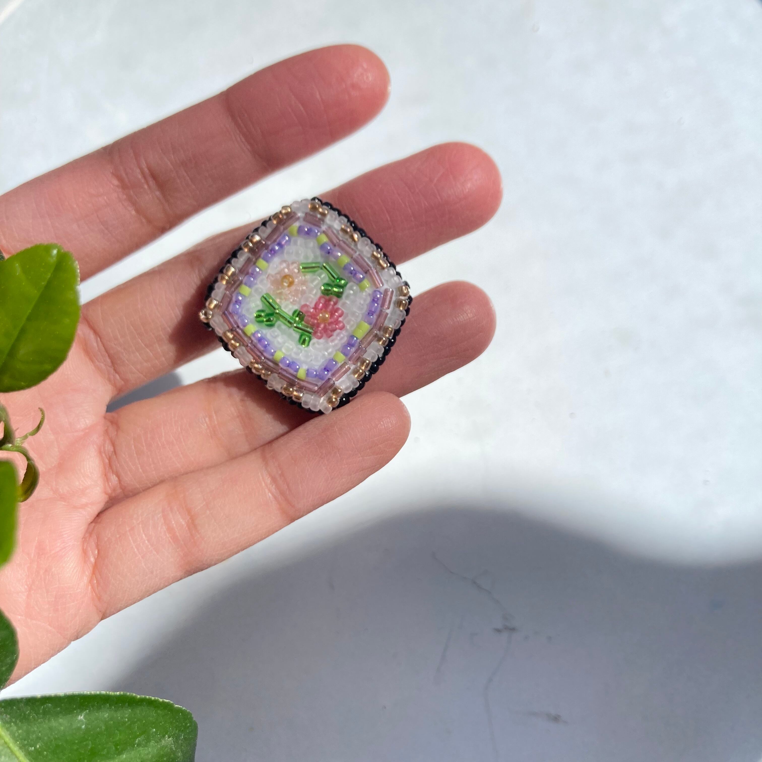 素材:ガラスのシードビーズ/スパングル/ナイロン糸/ポリエステル糸/フェルト薄手・厚手/真鍮ブローチピン(日本製)
