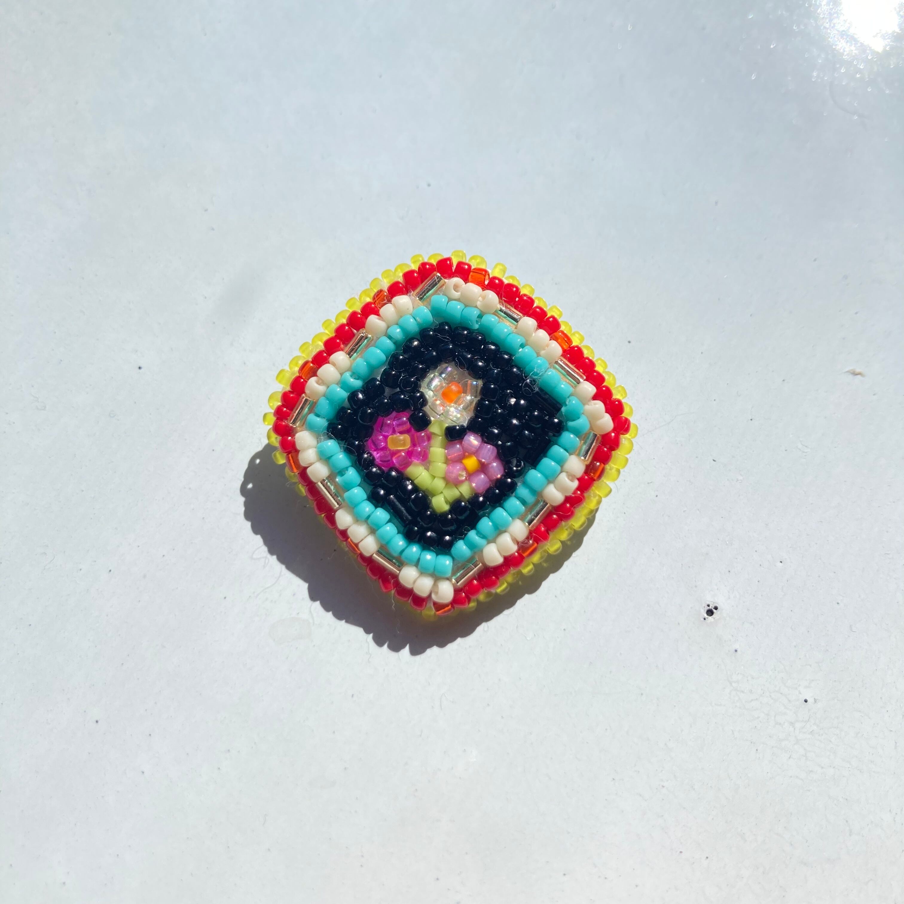 素材:ガラスのシードビーズ/ナイロン糸/ポリエステル糸/フェルト薄手・厚手/真鍮ブローチピン(日本製)