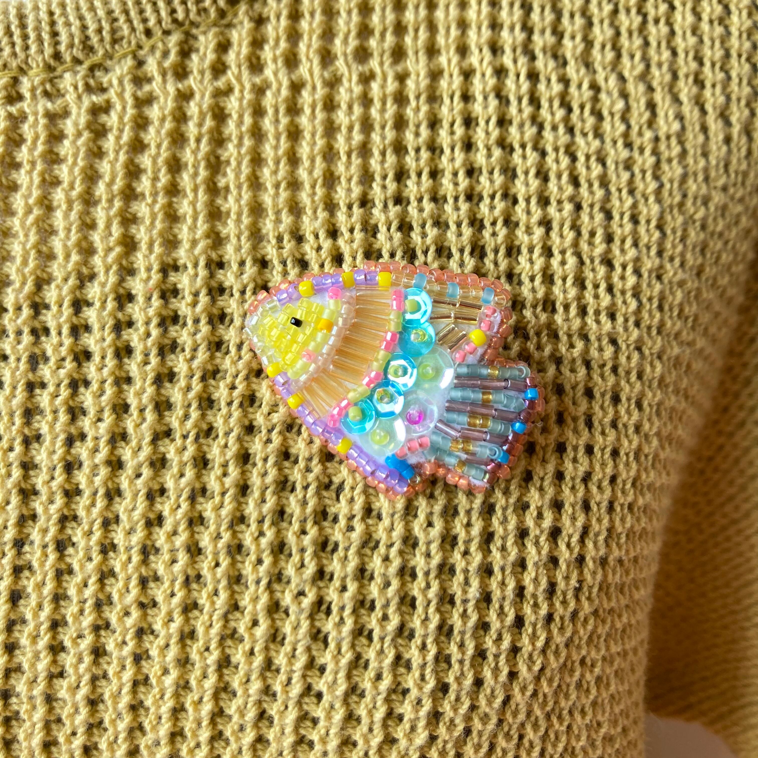 素材:ガラスのシードビーズ/スパングル/ナイロン糸/ポリエステル糸/フェルト薄手・厚手/真鍮ブローチピン(日本製)