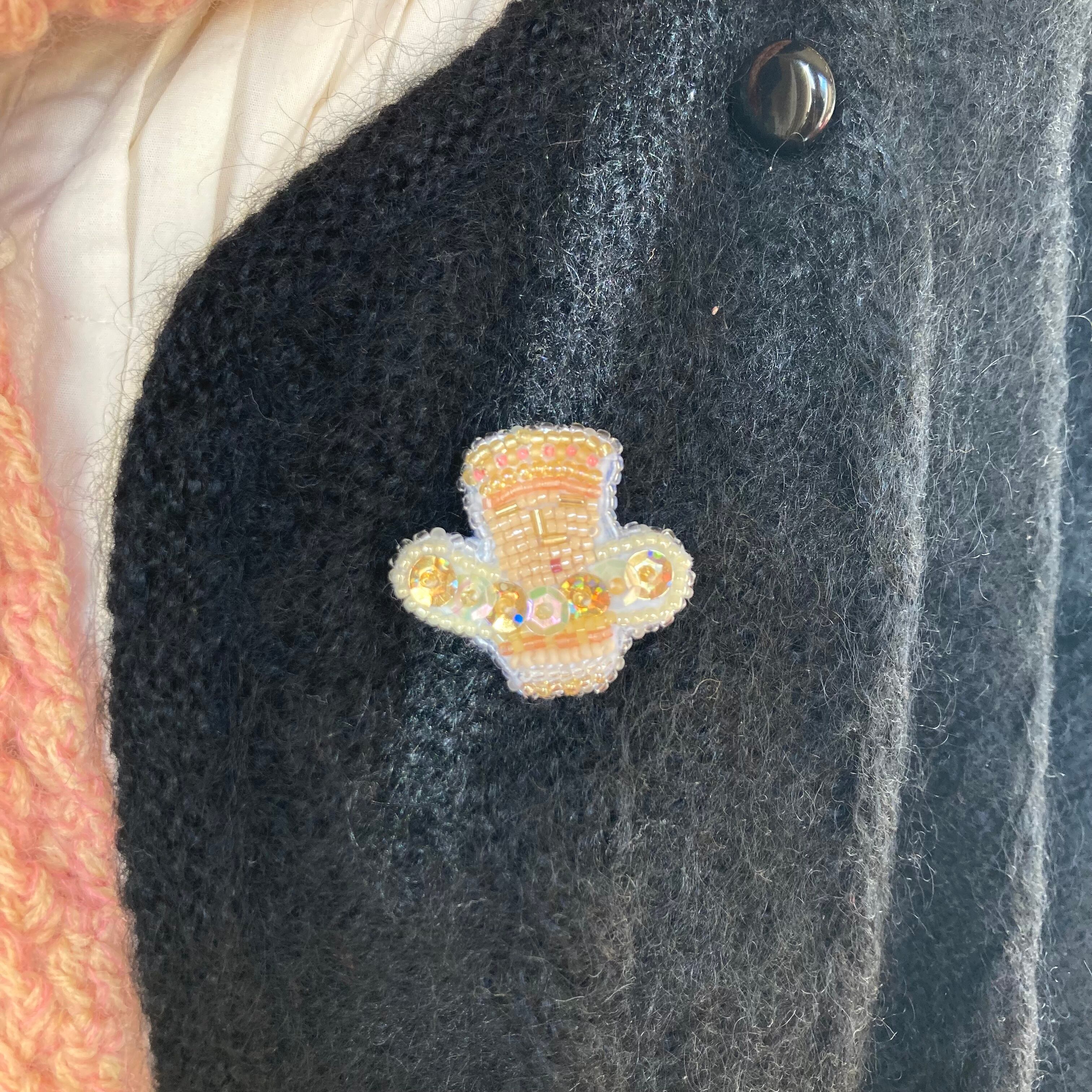 素材:ガラスのシードビーズ/スパングル/ナイロン糸/ポリエステル糸/フェルト薄手・厚手/真鍮ブローチピン(日本製)